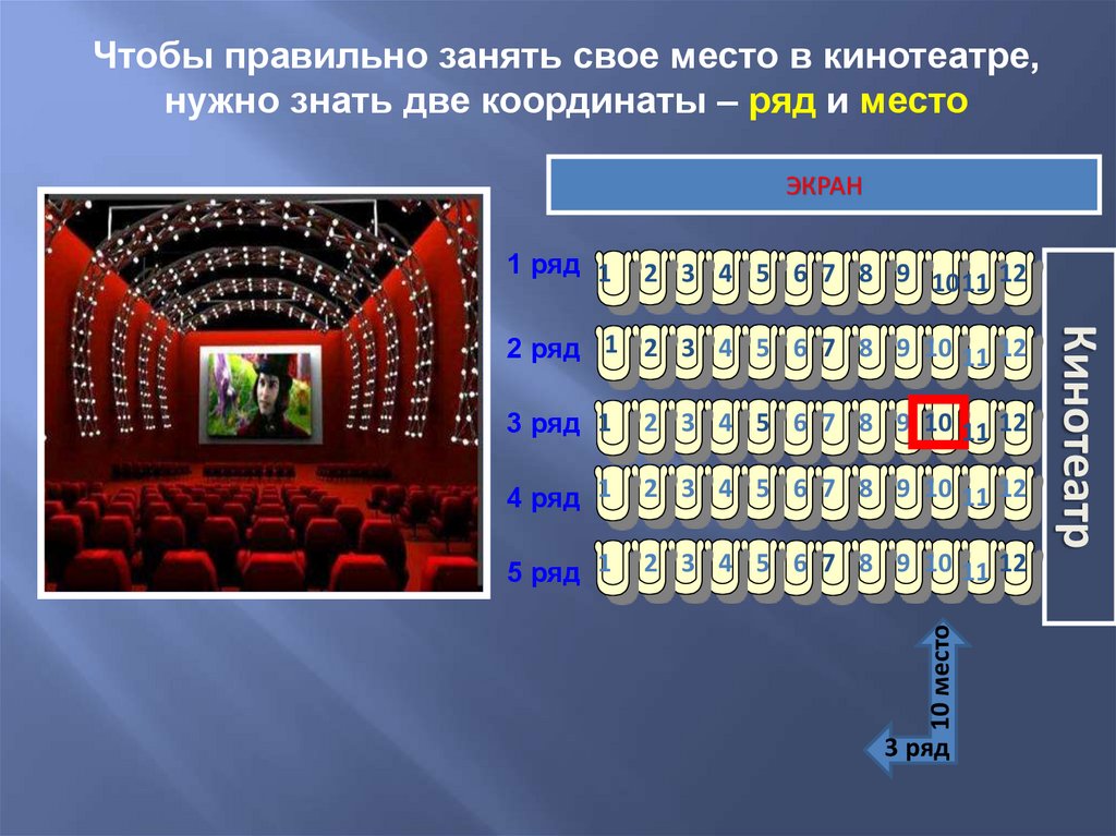 Чтобы правильно занять свое место в кинотеатре,нужно знать две координаты – ряд и место