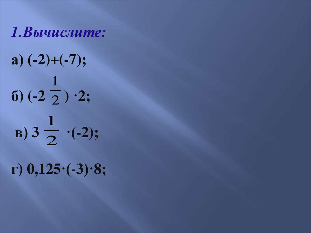 1.Вычислите:а) (-2)+(-7);