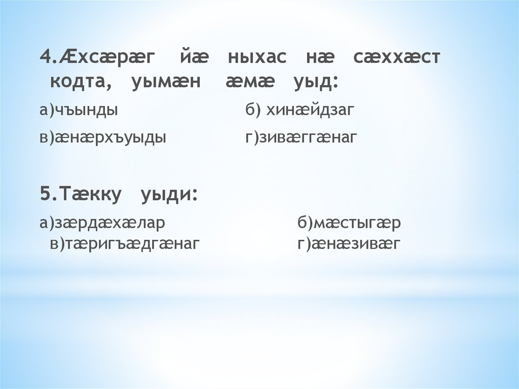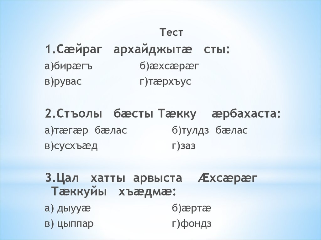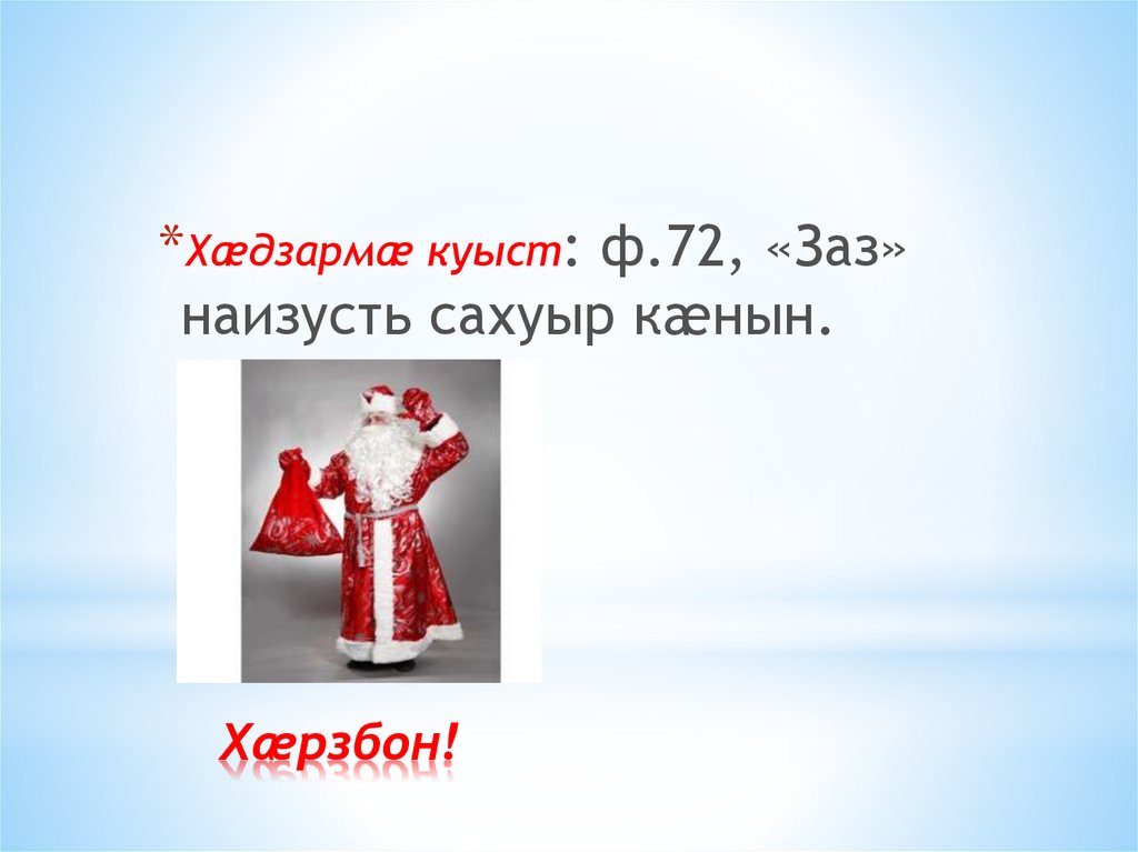 *Хæдзармæ куыст: ф.72, «Заз»наизусть сахуыр кæнын.
