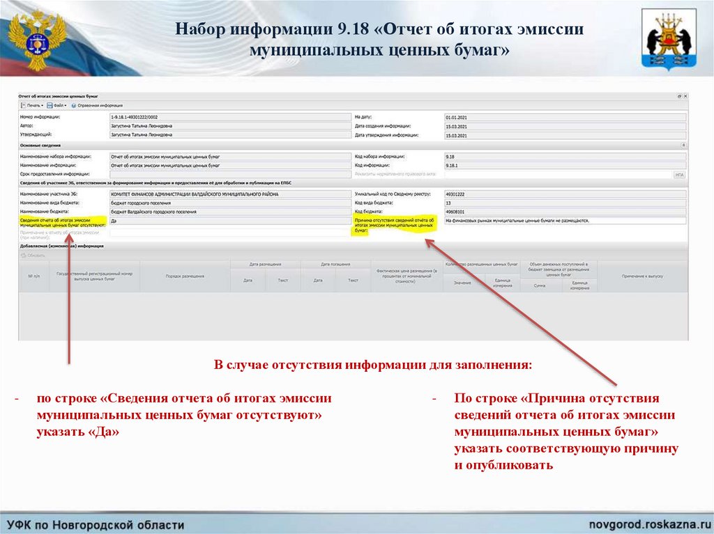 Набор информации 9.18 «Отчет об итогах эмиссиимуниципальных ценных бумаг»