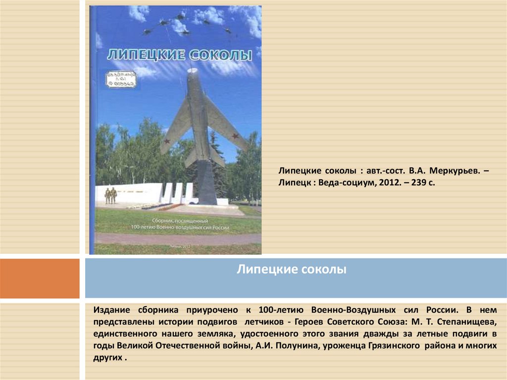 Липецкие соколы : авт.-сост. В.А. Меркурьев. –Липецк : Веда-социум, 2012. – 239 с.