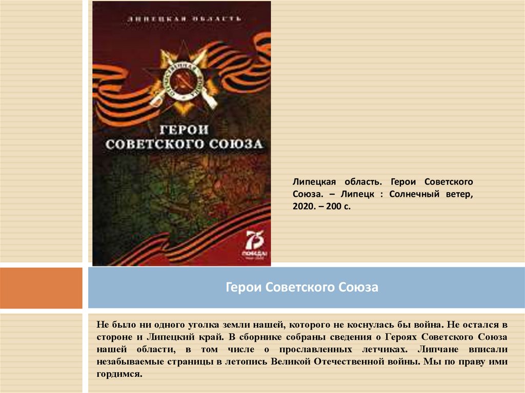стороне и Липецкий край. В сборнике собраны сведения о Героях Советского Союза