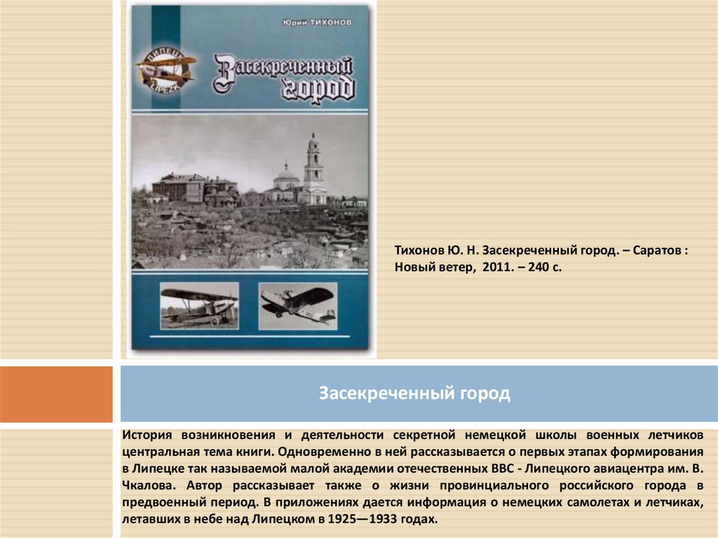 Тихонов Ю. Н. Засекреченный город. – Саратов :Новый ветер, 2011. – 240 с.