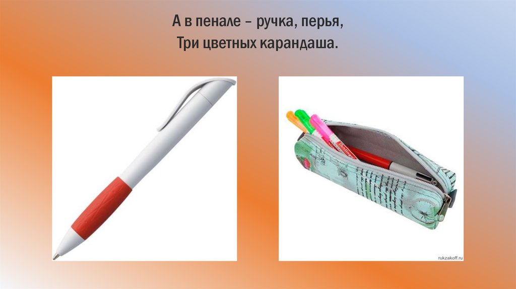 А в пенале – ручка, перья,Три цветных карандаша.