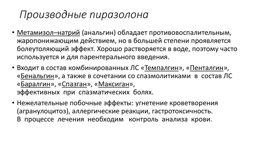 Производные пиразолона• Метамизол–натрий (анальгин) обладает противовоспалительным,