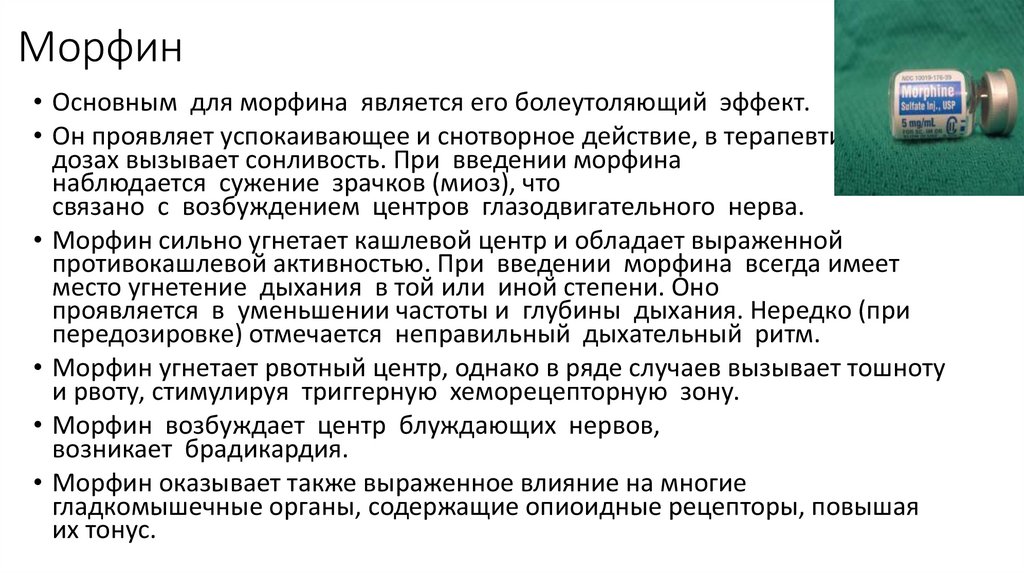 Морфин• Основным для морфина является его болеутоляющий эффект.