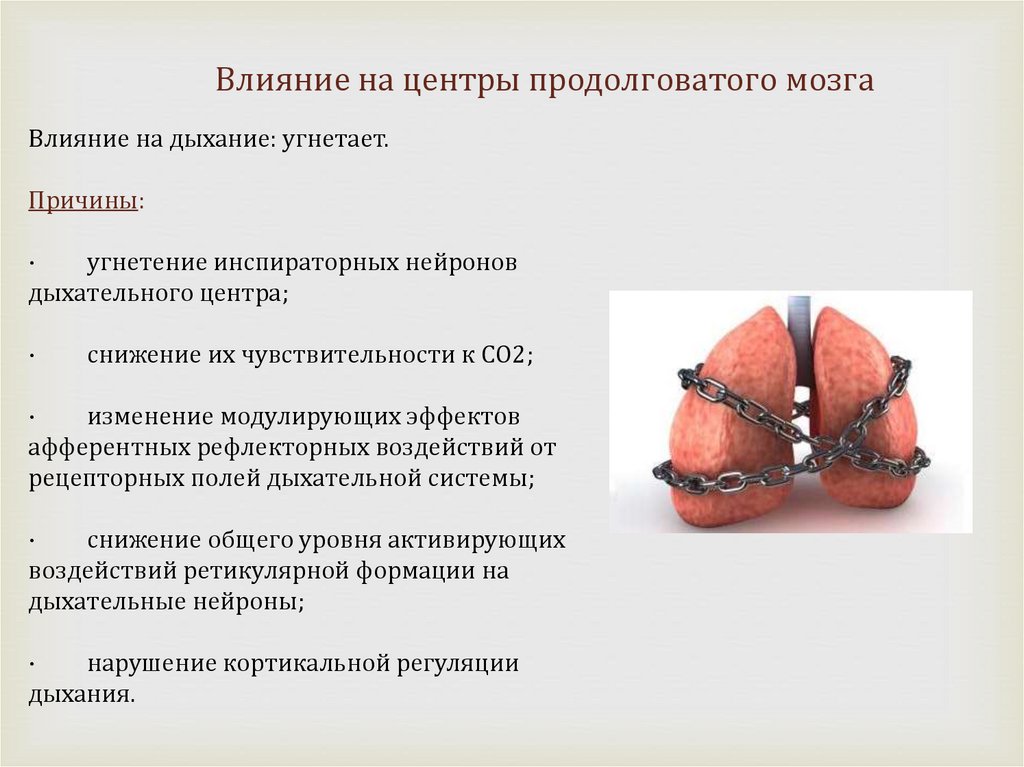 Влияние на центры продолговатого мозгаВлияние на дыхание: угнетает.