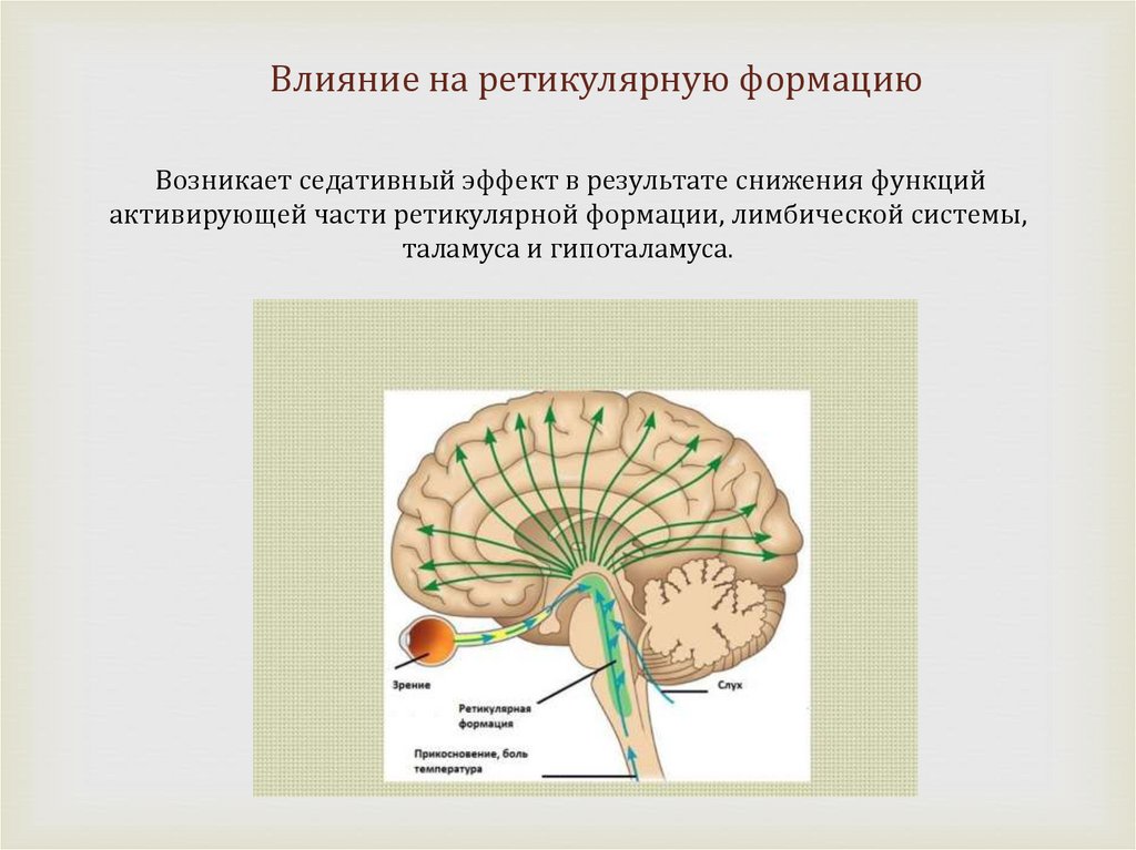 Влияние на ретикулярную формациюВозникает седативный эффект в результате снижения функций