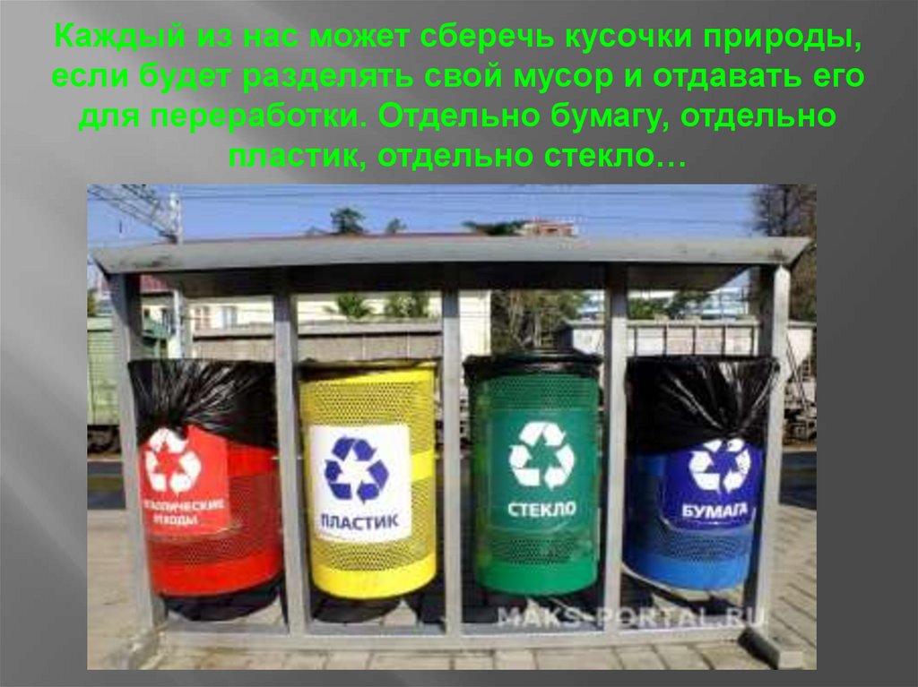 Каждый из нас может сберечь кусочки природы,если будет разделять свой мусор и отдавать его