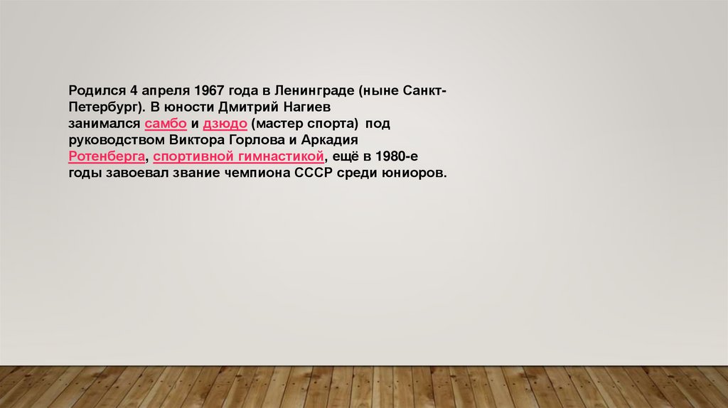 Родился 4 апреля 1967 года в Ленинграде (ныне СанктПетербург). В юности Дмитрий Нагиевзанимался самбо и дзюдо (мастер спорта) под
