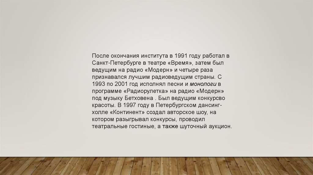 После окончания института в 1991 году работал вСанкт-Петербурге в театре «Время», затем был