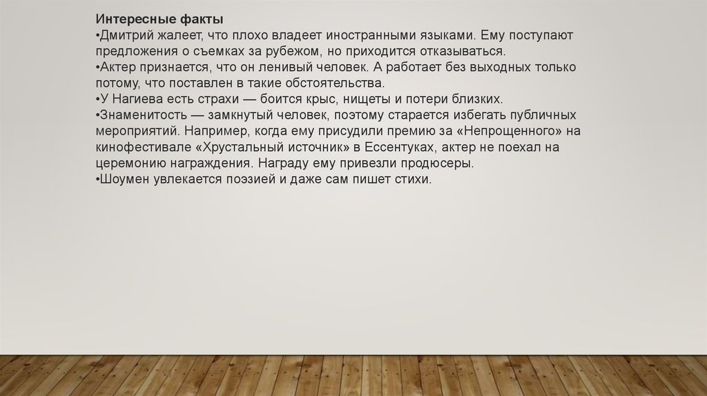 Интересные факты•Дмитрий жалеет, что плохо владеет иностранными языками. Ему поступают