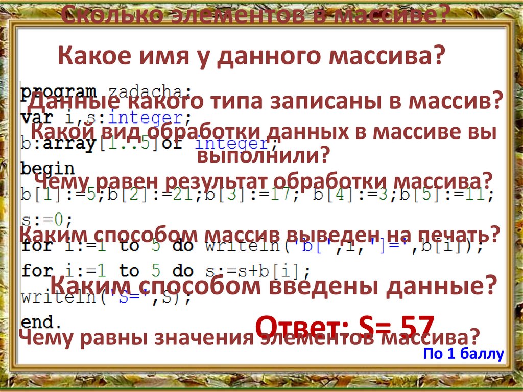 Сколько элементов в массиве?Какое имя у данного массива?