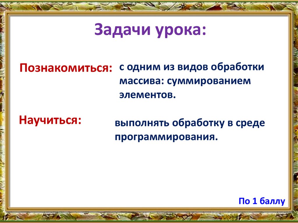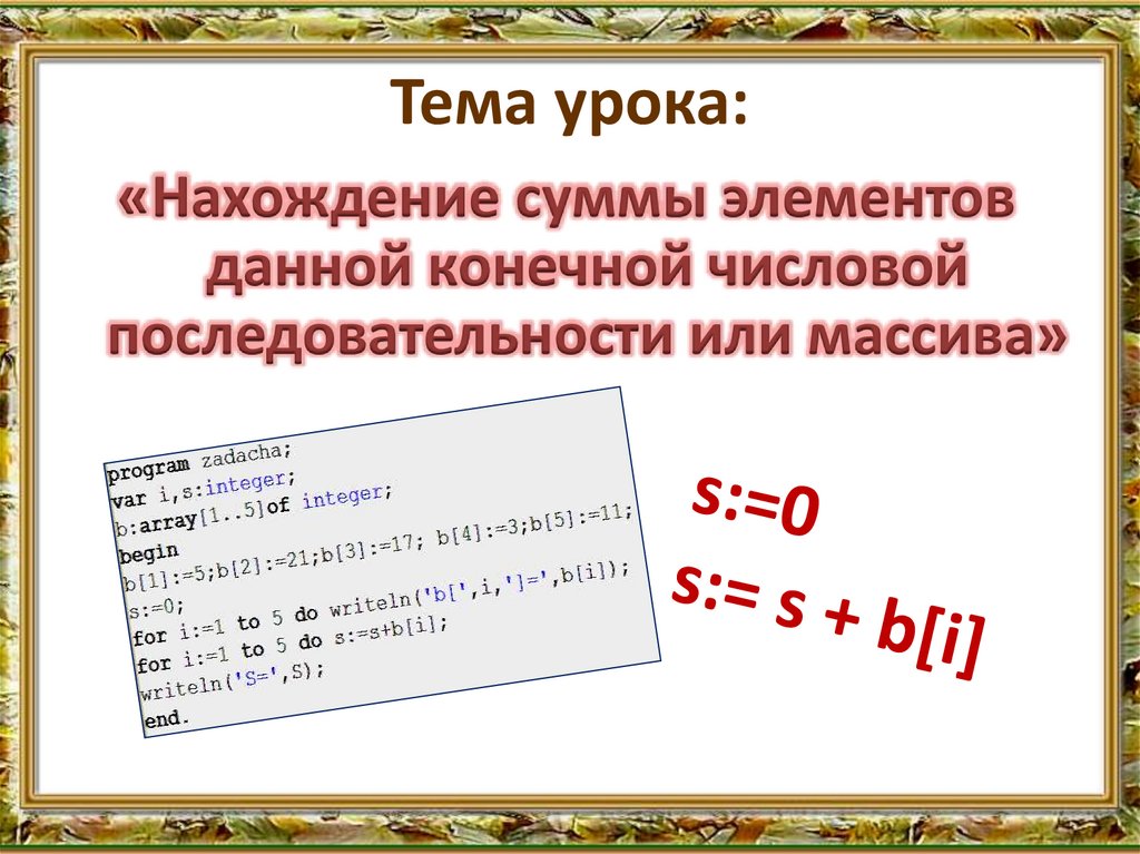 Тема урока:«Нахождение суммы элементов
