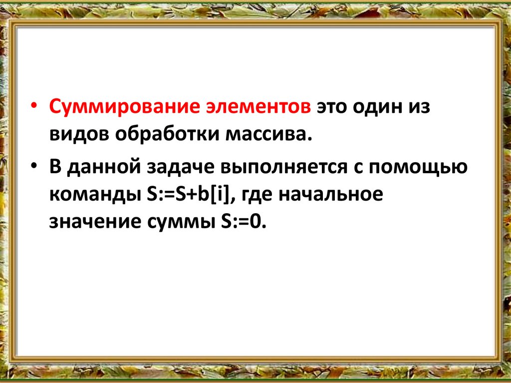 • Суммирование элементов это один извидов обработки массива.