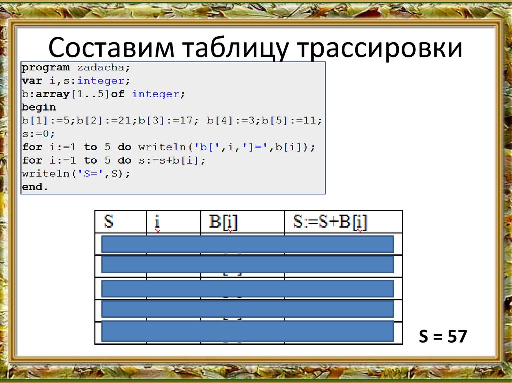 Составим таблицу трассировкиS = 57