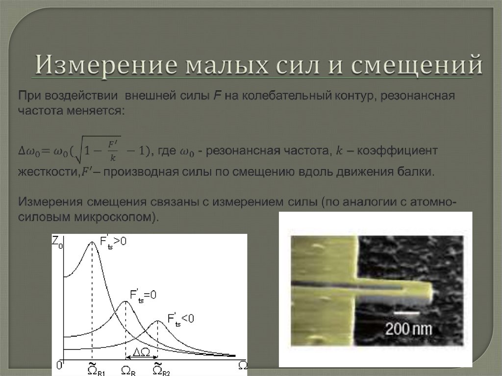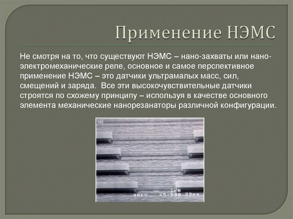 Не смотря на то, что существуют НЭМС – нано-захваты или наноэлектромеханические реле, основное и самое перспективноеприменение НЭМС – это датчики ультрамалых масс, сил,