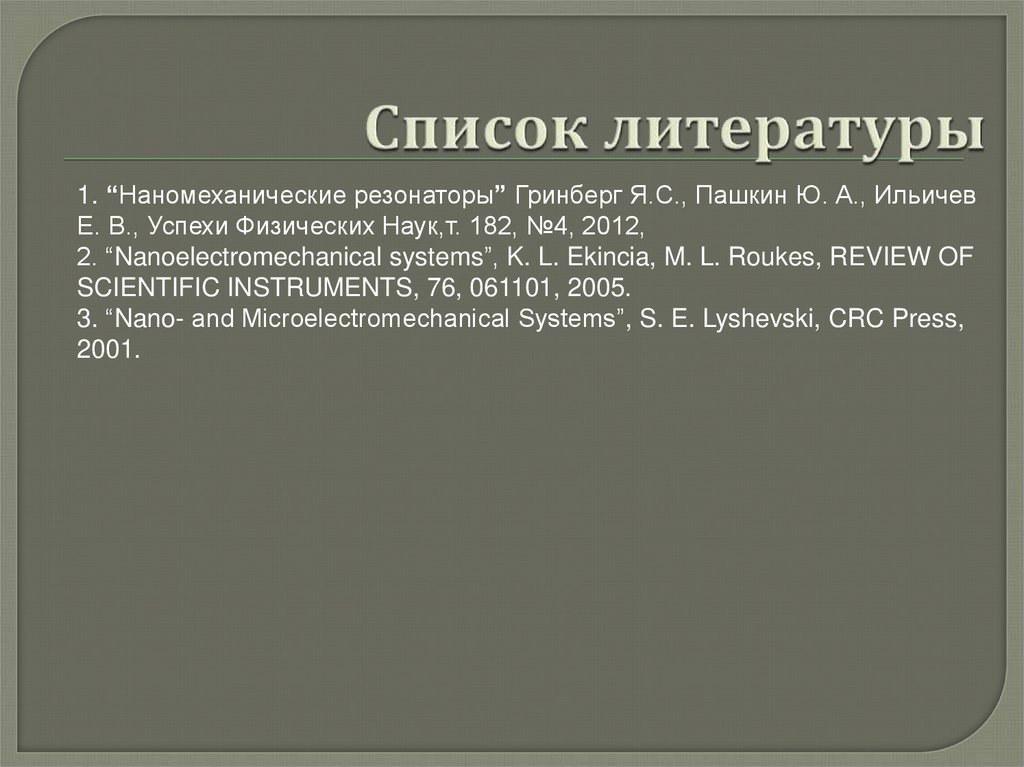 1. “Наномеханические резонаторы” Гринберг Я.С., Пашкин Ю. А., ИльичевЕ. В., Успехи Физических Наук,т. 182, №4, 2012,