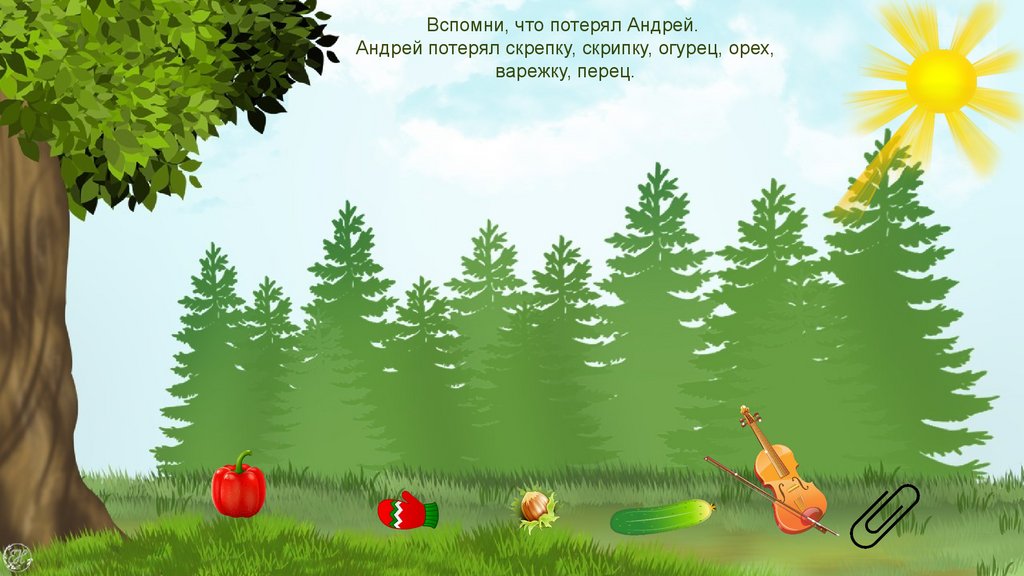 Вспомни, что потерял Андрей.Андрей потерял скрепку, скрипку, огурец, орех,