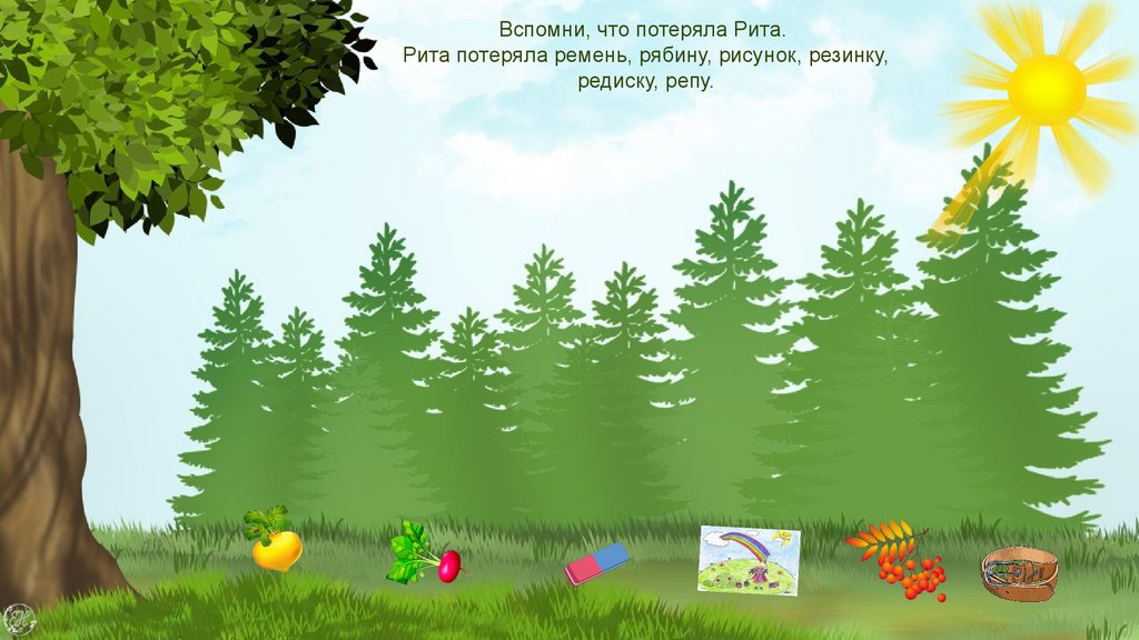 Вспомни, что потеряла Рита.Рита потеряла ремень, рябину, рисунок, резинку,