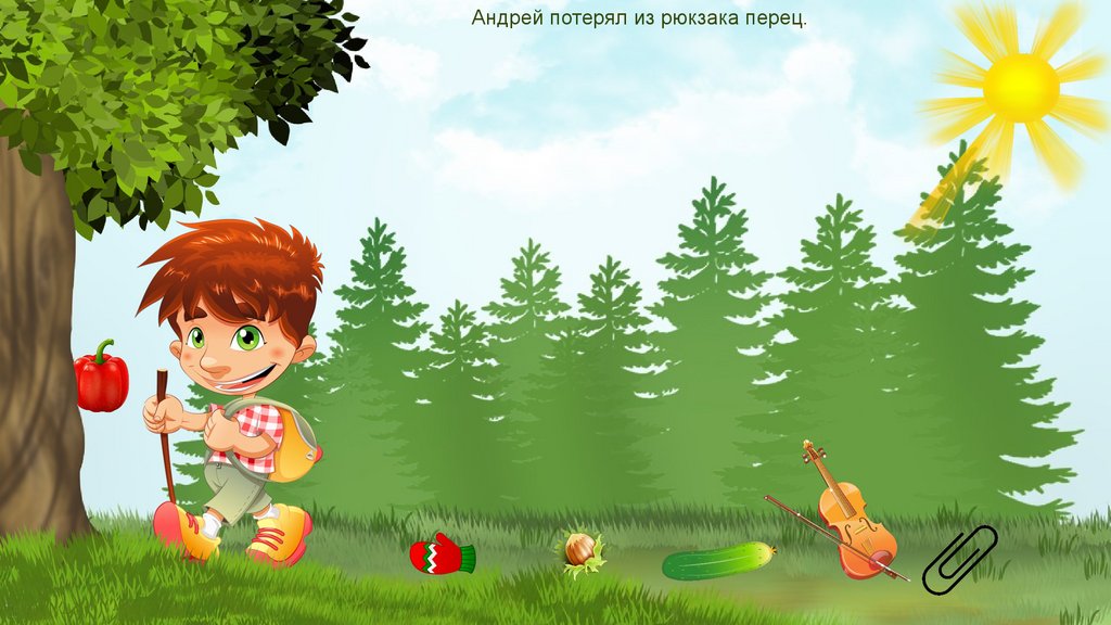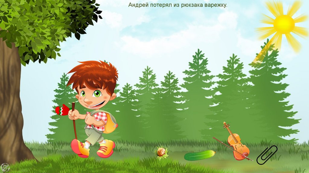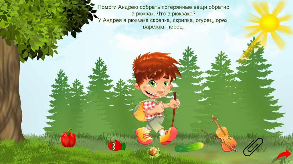Помоги Андрею собрать потерянные вещи обратнов рюкзак. Что в рюкзаке?