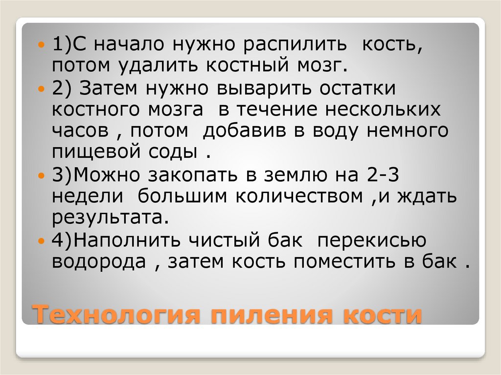 1)С начало нужно распилить кость,потом удалить костный мозг.