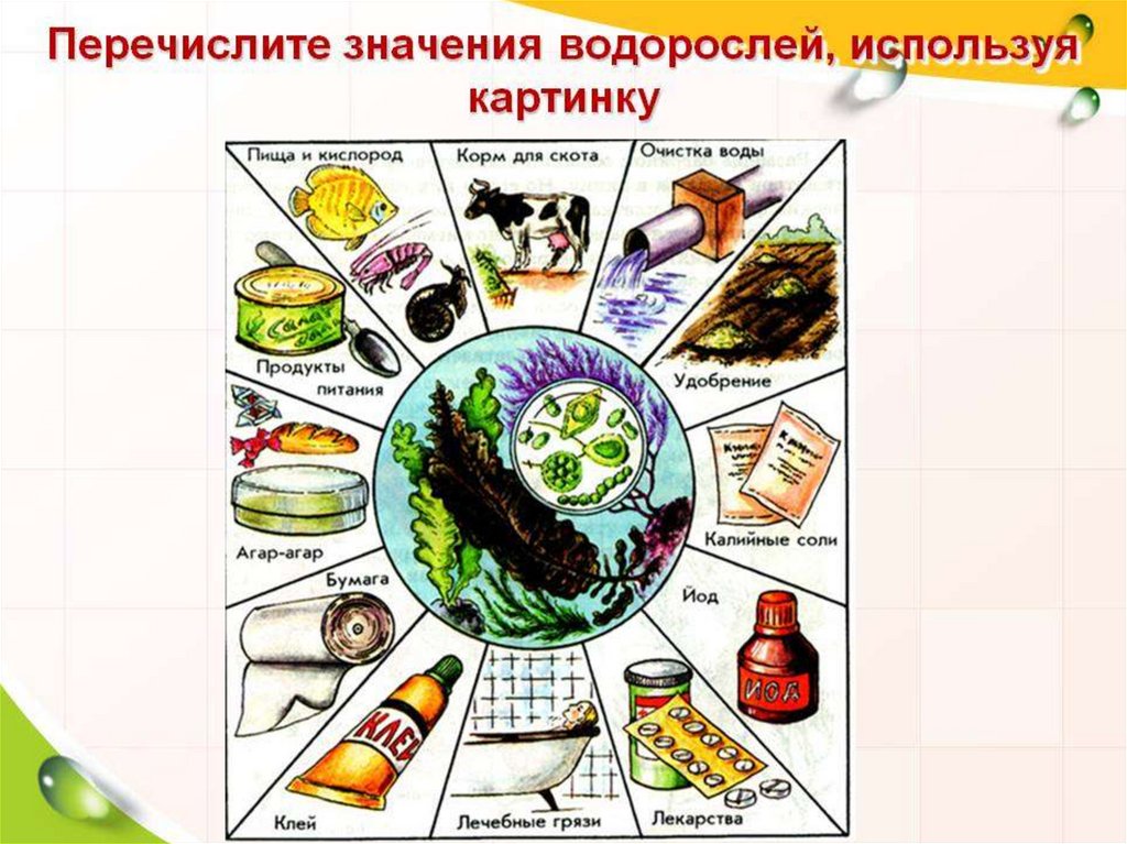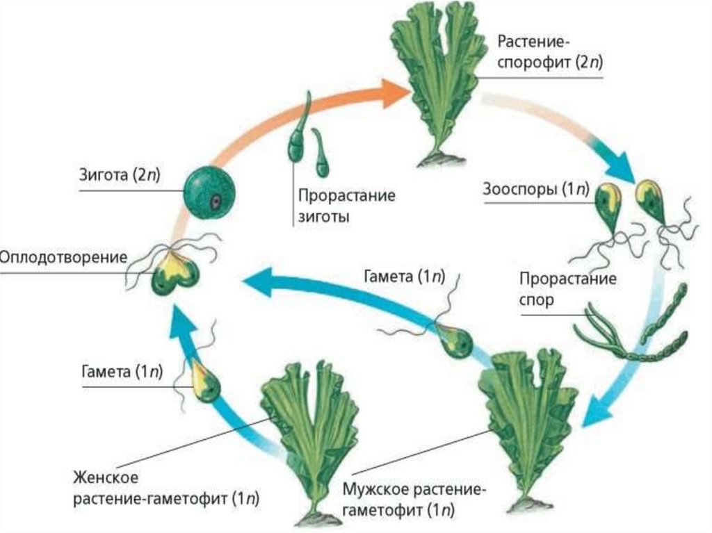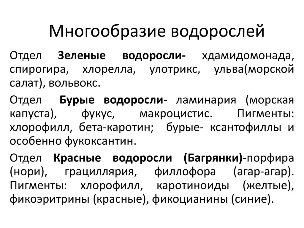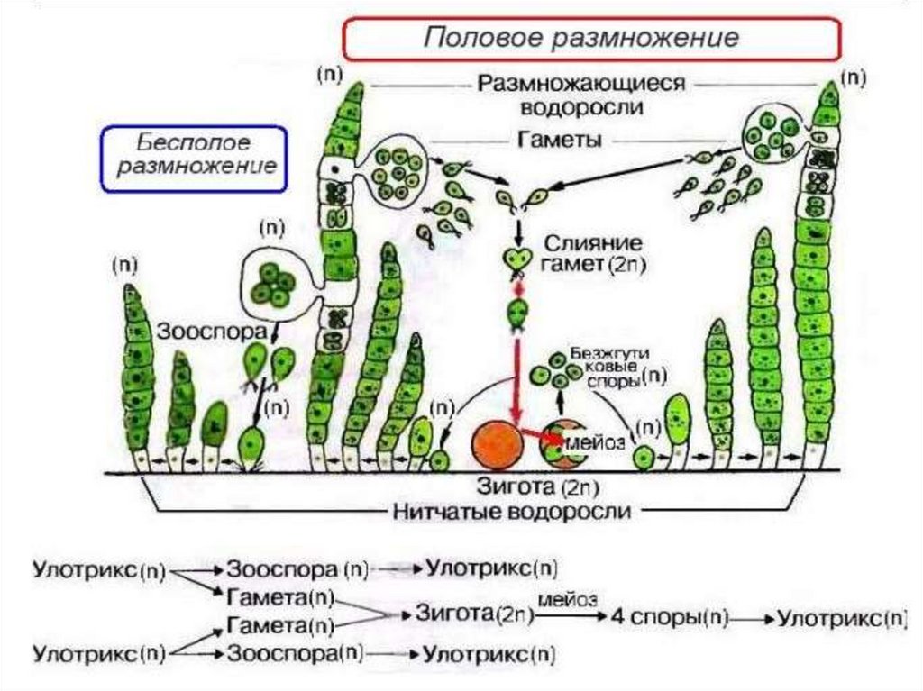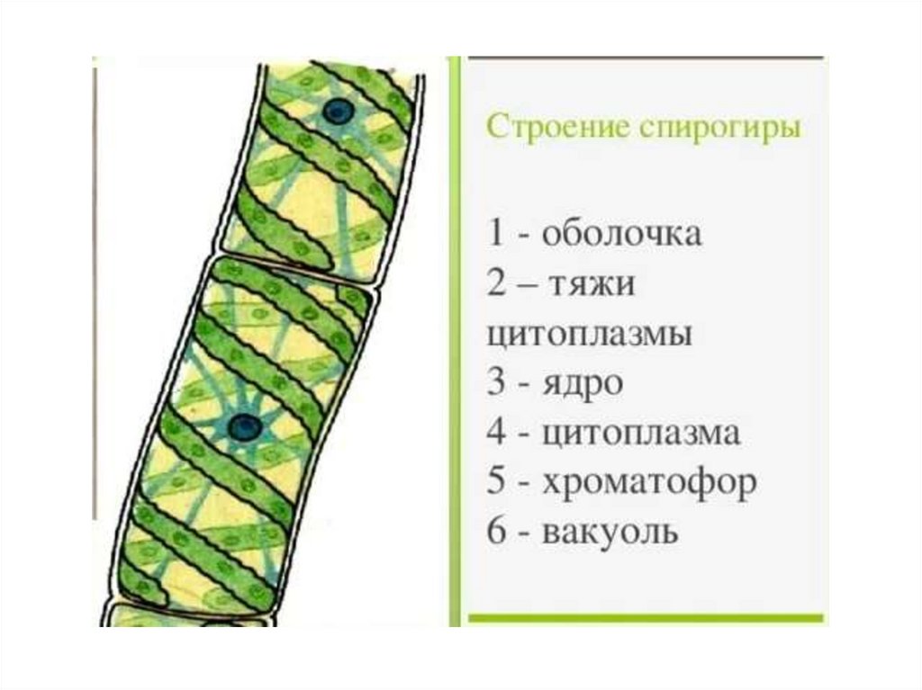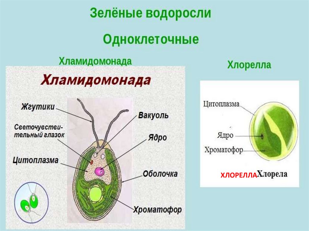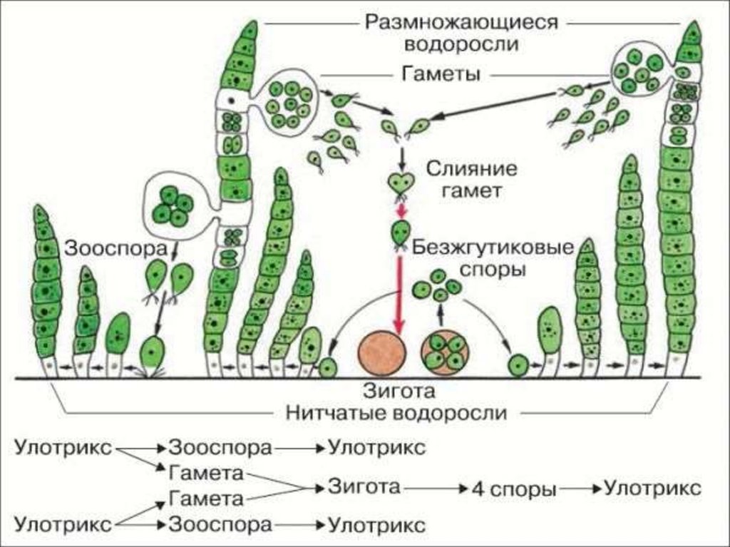 спирогира, хлорелла, улотрикс, ульва(морской