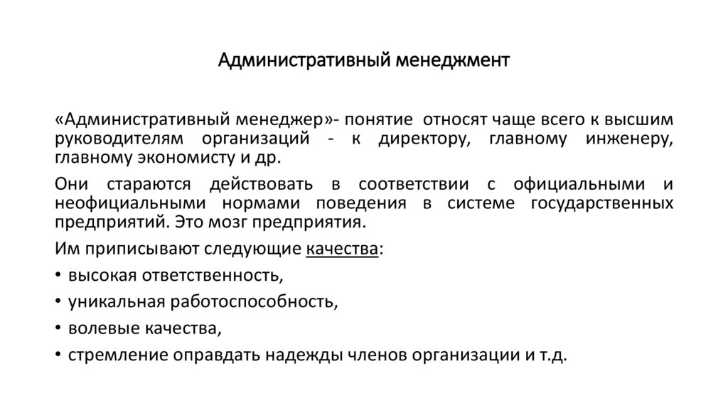 Административный менеджмент«Административный менеджер»- понятие относят чаще всего к высшим