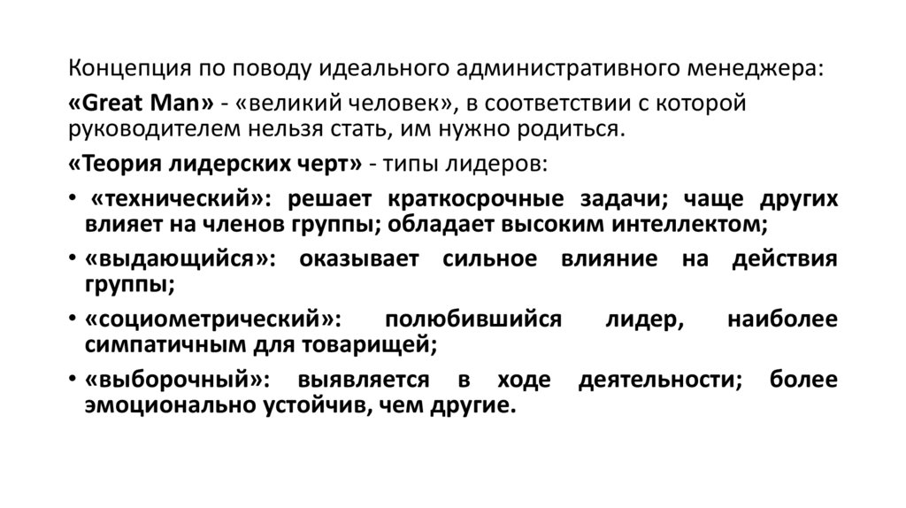 Концепция по поводу идеального административного менеджера:«Great Man» - «великий человек», в соответствии с которой