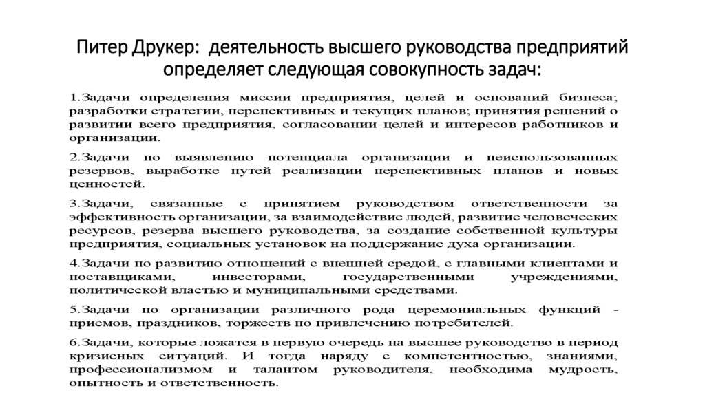 Питер Друкер: деятельность высшего руководства предприятийопределяет следующая совокупность задач: