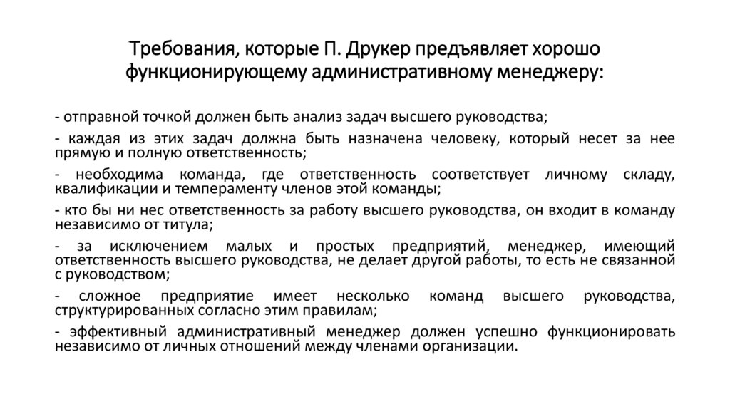Требования, которые П. Друкер предъявляет хорошофункционирующему административному менеджеру: