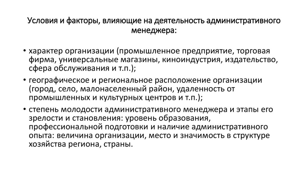 Условия и факторы, влияющие на деятельность административногоменеджера: