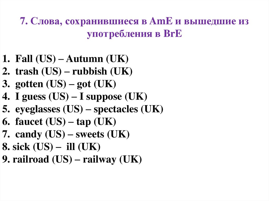 7. Слова, сохранившиеся в AmE и вышедшие изупотребления в BrE