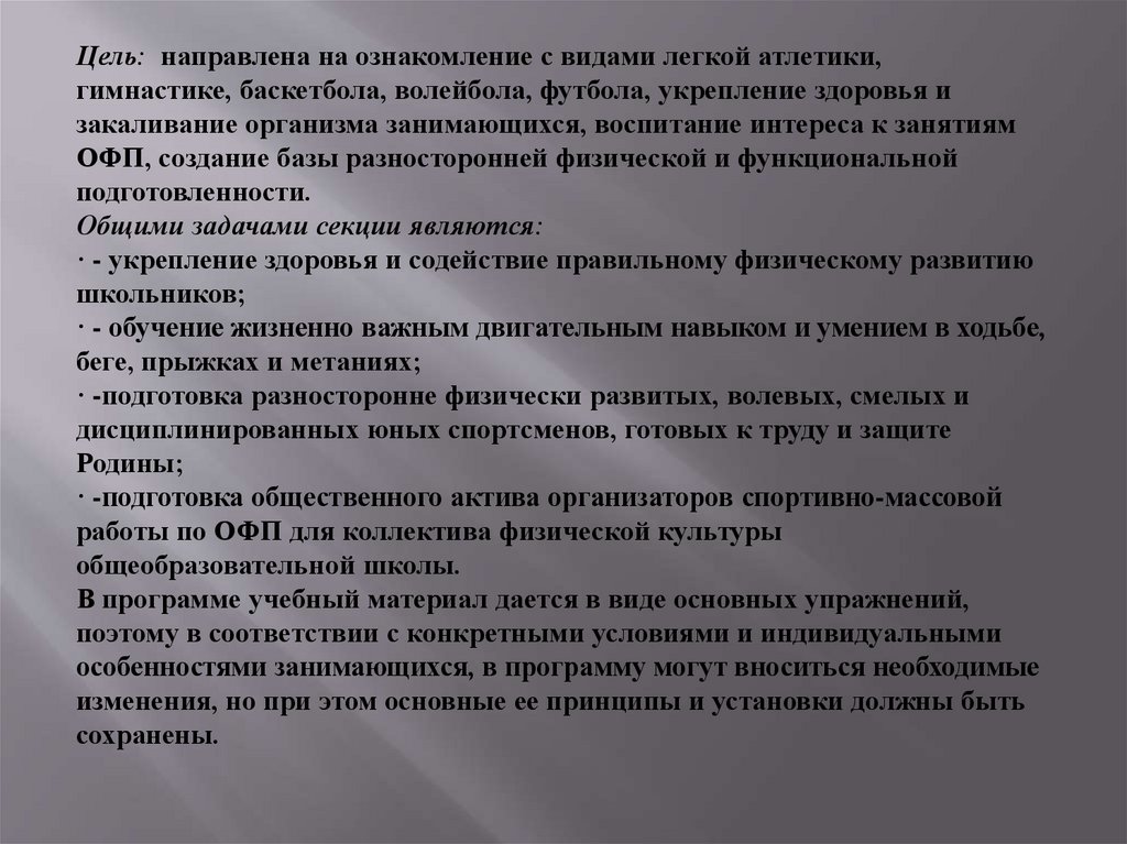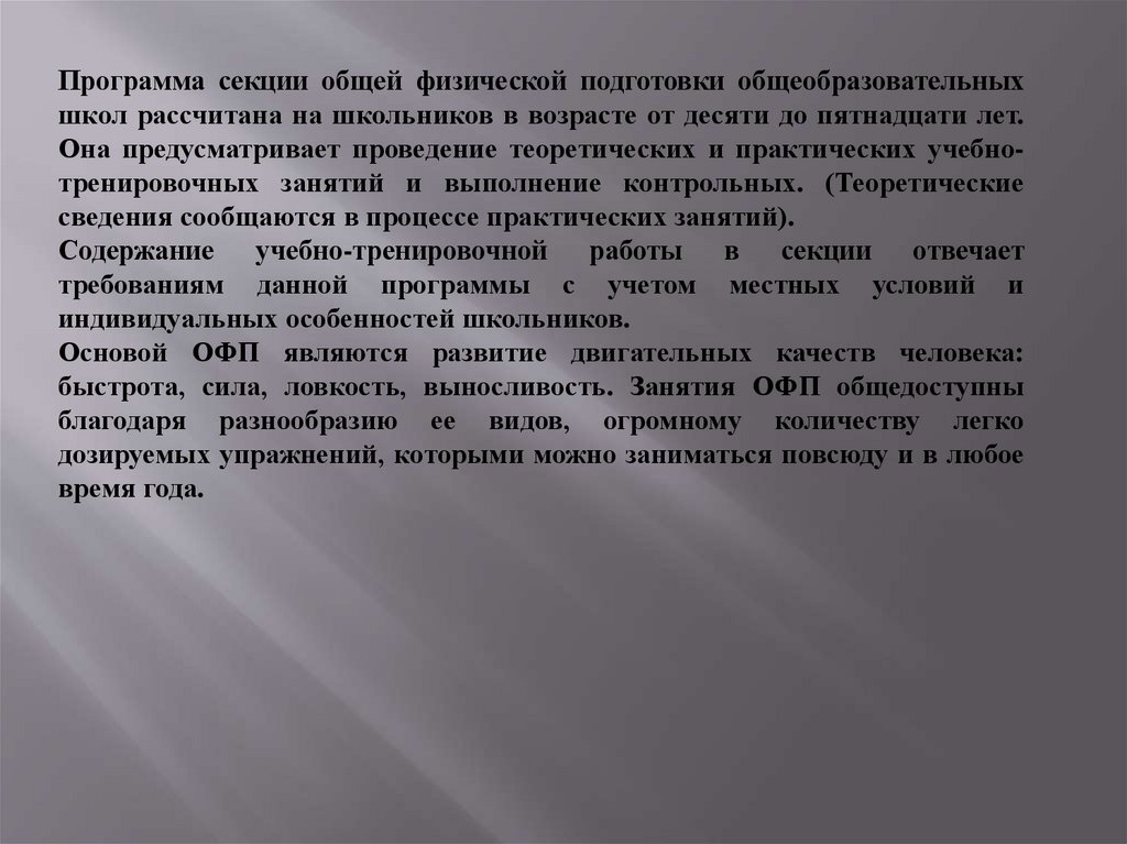 Программа секции общей физической подготовки общеобразовательныхшкол рассчитана на школьников в возрасте от десяти до пятнадцати лет.