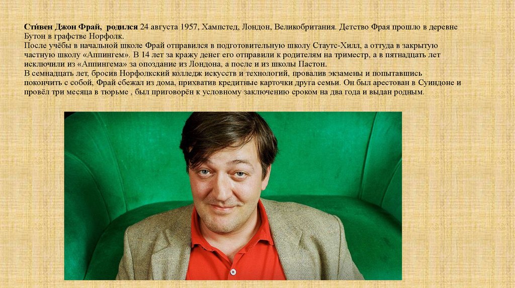 Сти́вен Джон Фрай, родился 24 августа 1957, Хампстед, Лондон, Великобритания. Детство Фрая прошло в деревнеБутон в графстве Норфолк.