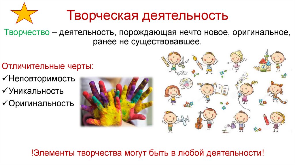 Творческая деятельностьТворчество – деятельность, порождающая нечто новое, оригинальное,
