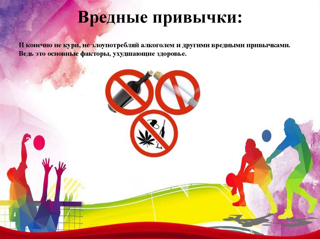 Вредные привычки:И конечно не кури, не злоупотребляй алкоголем и другими вредными привычками.