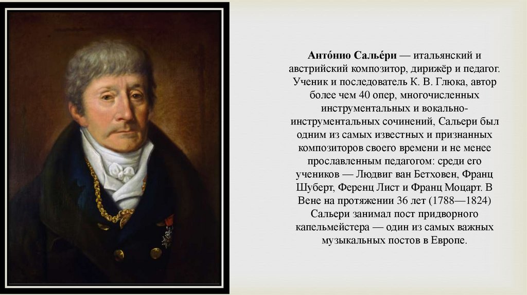 Итальянский композитор, педагог и дирижер А.Сальери был одним из наиболее знаменитых деятелей