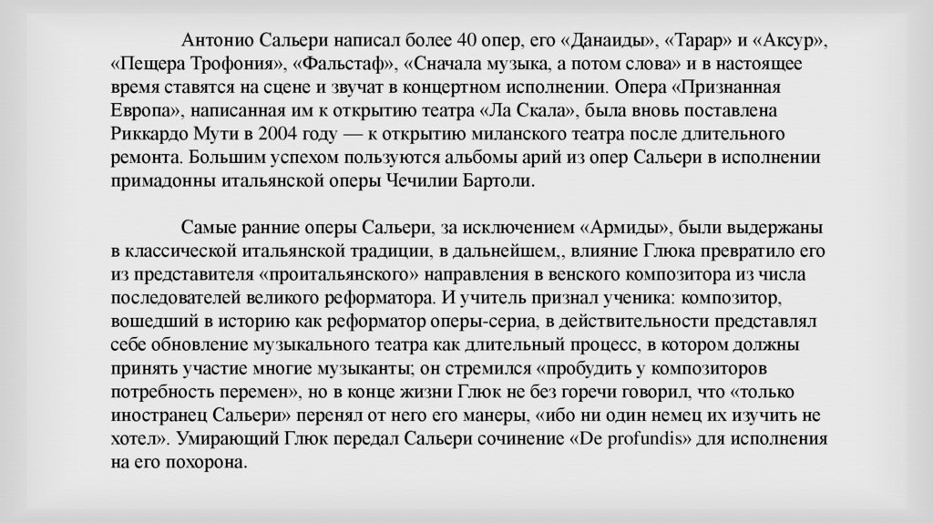 Антонио Сальери написал более 40 опер, его «Данаиды», «Тарар» и «Аксур»,«Пещера Трофония», «Фальстаф», «Сначала музыка, а потом слова» и в настоящее