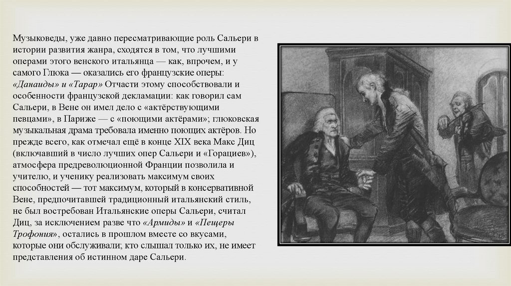 Музыковеды, уже давно пересматривающие роль Сальери вистории развития жанра, сходятся в том, что лучшими