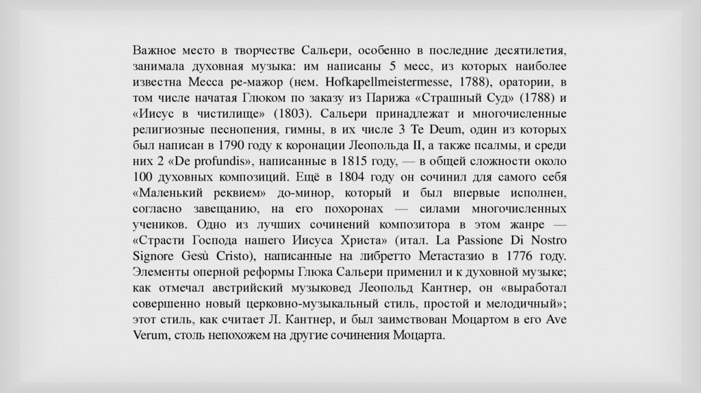 Элементы оперной реформы Глюка Сальери применил и к духовной музыке;