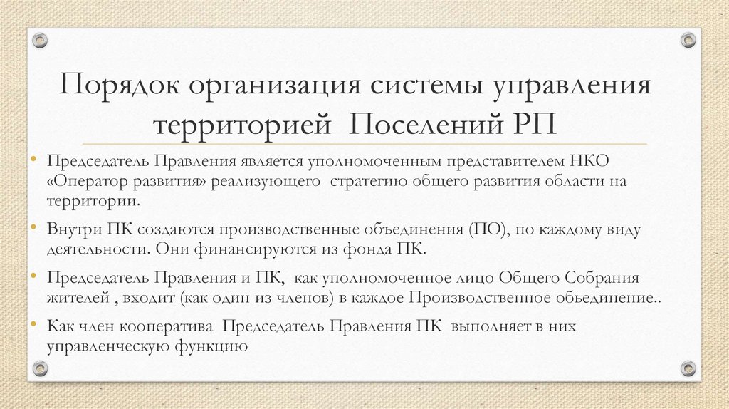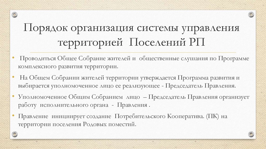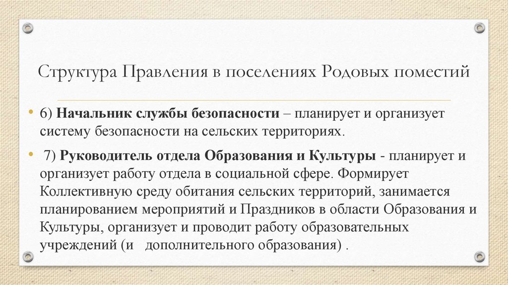 Структура Правления в поселениях Родовых поместий• 6) Начальник службы безопасности – планирует и организует