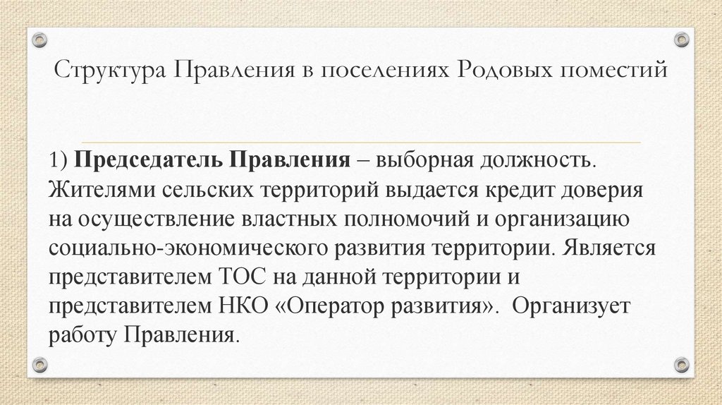 Структура Правления в поселениях Родовых поместий1) Председатель Правления – выборная должность.