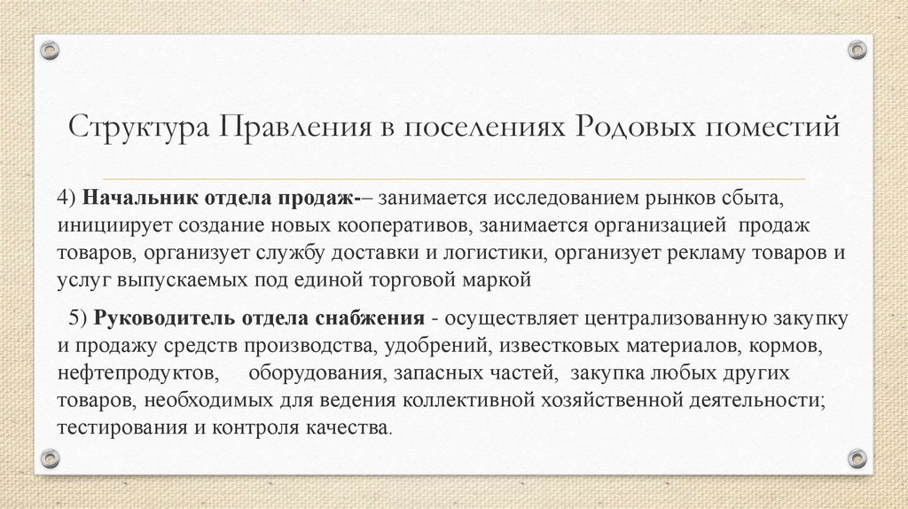 Структура Правления в поселениях Родовых поместий4) Начальник отдела продаж-– занимается исследованием рынков сбыта,