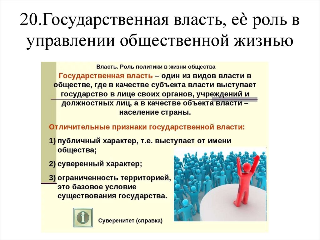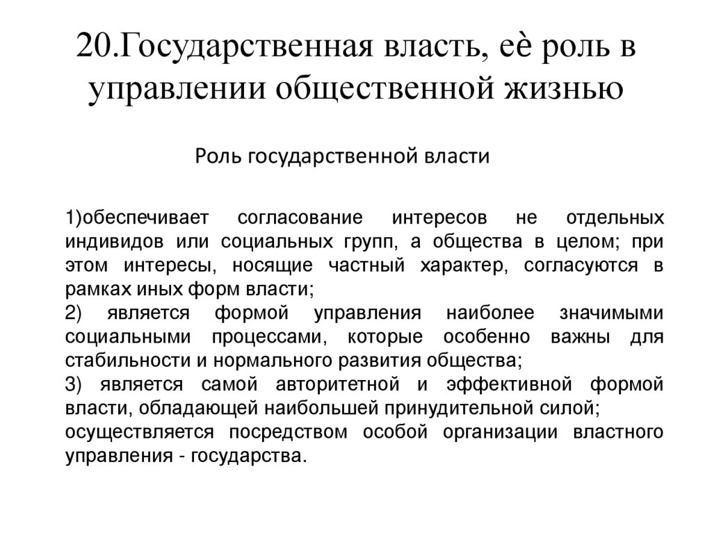 20.Государственная власть, еѐ роль вуправлении общественной жизнью