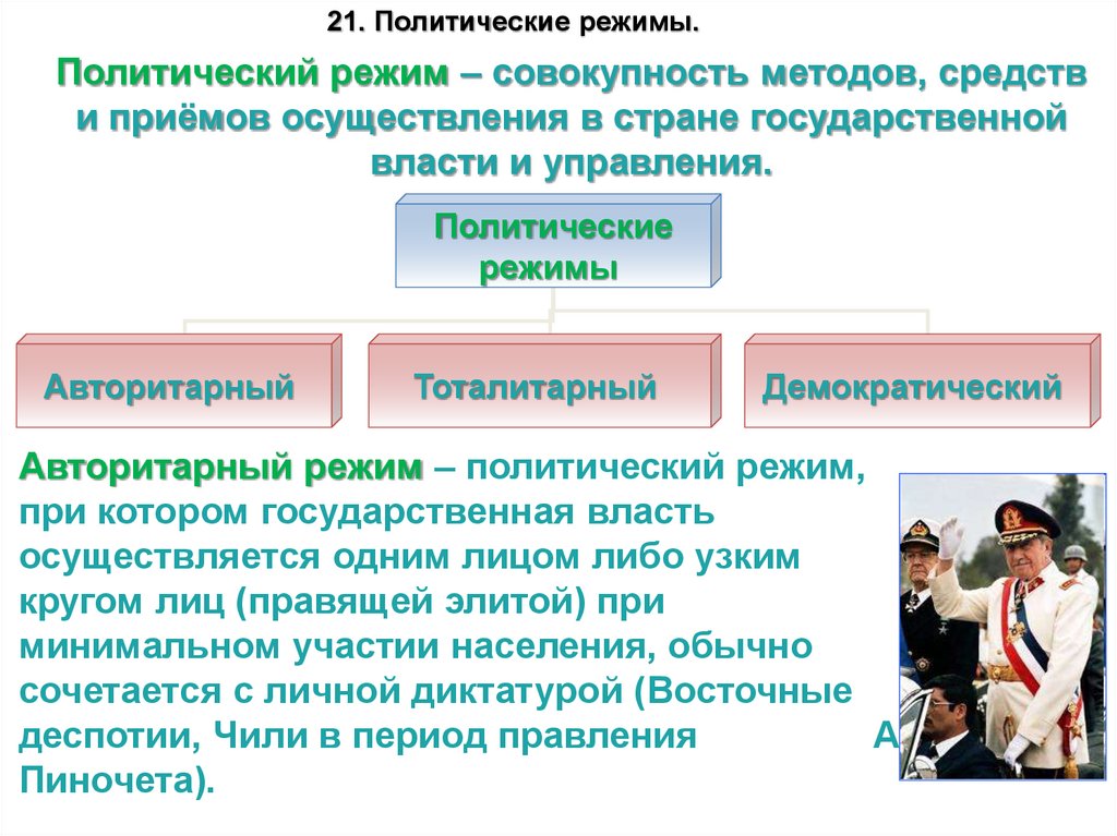 21. Политические режимы.Политический режим – совокупность методов, средств