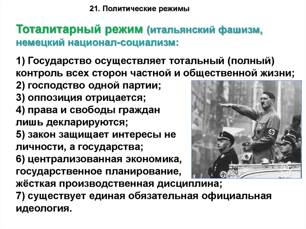 21. Политические режимыТоталитарный режим (итальянский фашизм,