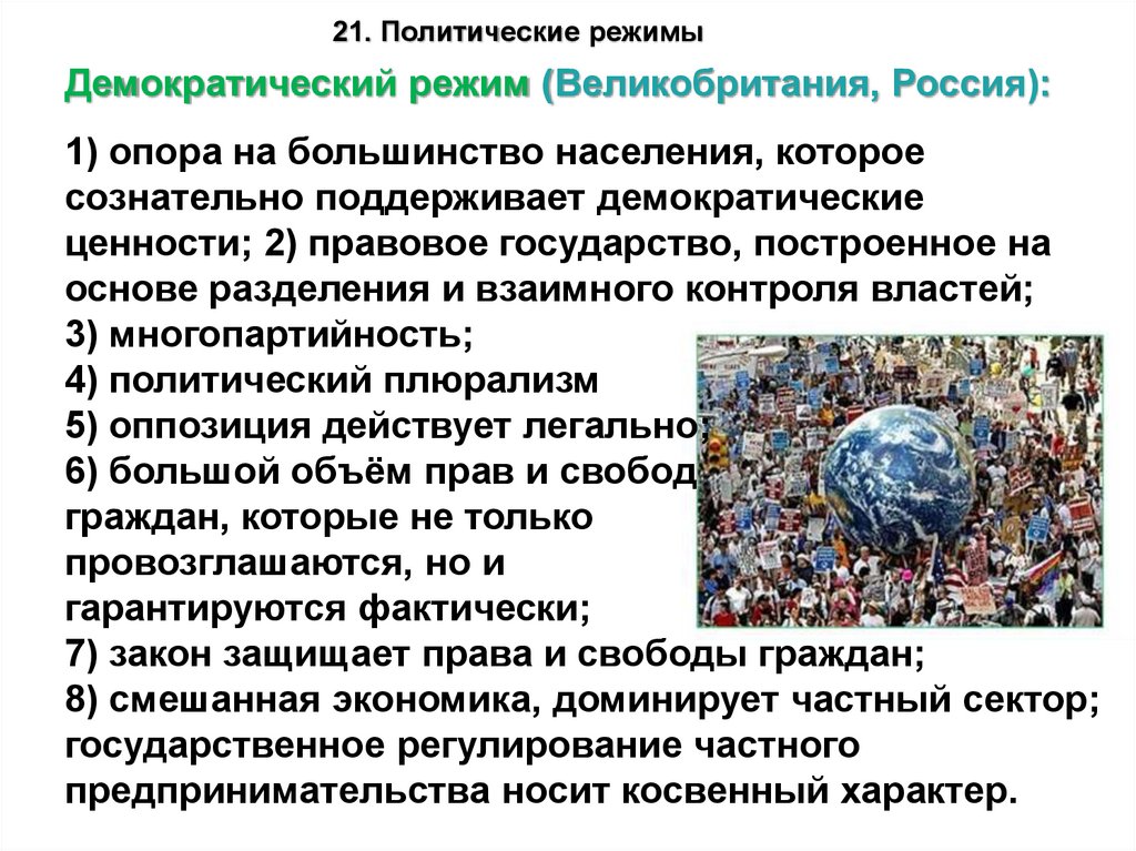 21. Политические режимыДемократический режим (Великобритания, Россия):
