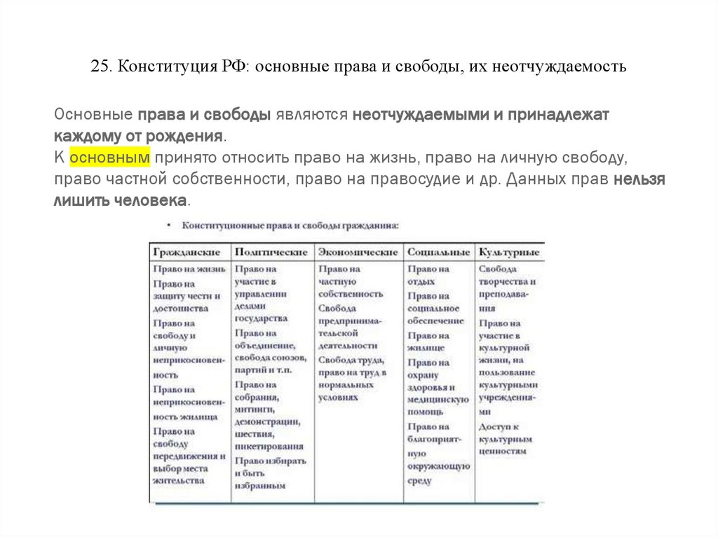 25. Конституция РФ: основные права и свободы, их неотчуждаемостьОсновные права и свободы являются неотчуждаемыми и принадлежат