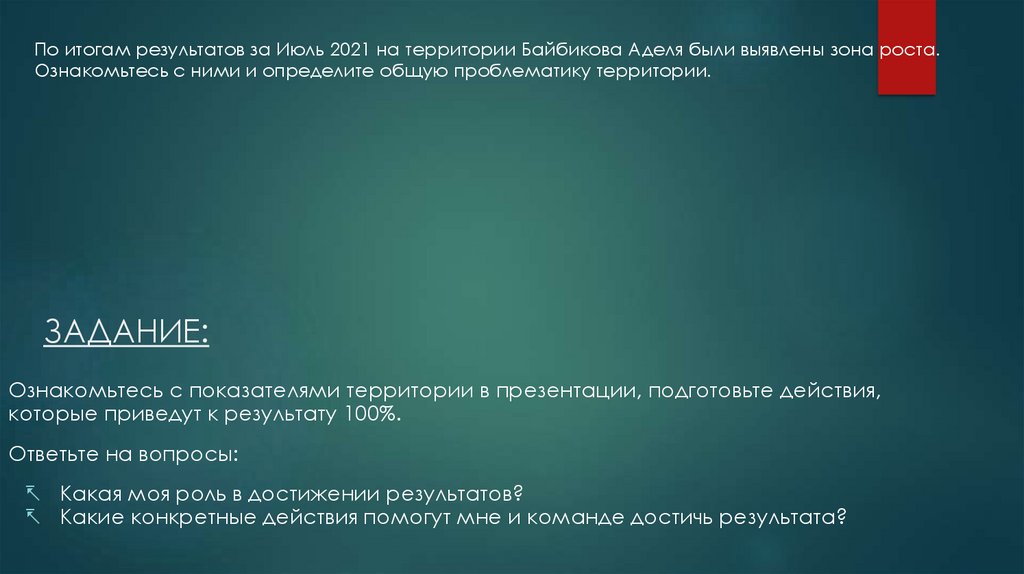 Ознакомьтесь с показателями территории в презентации, подготовьте действия,